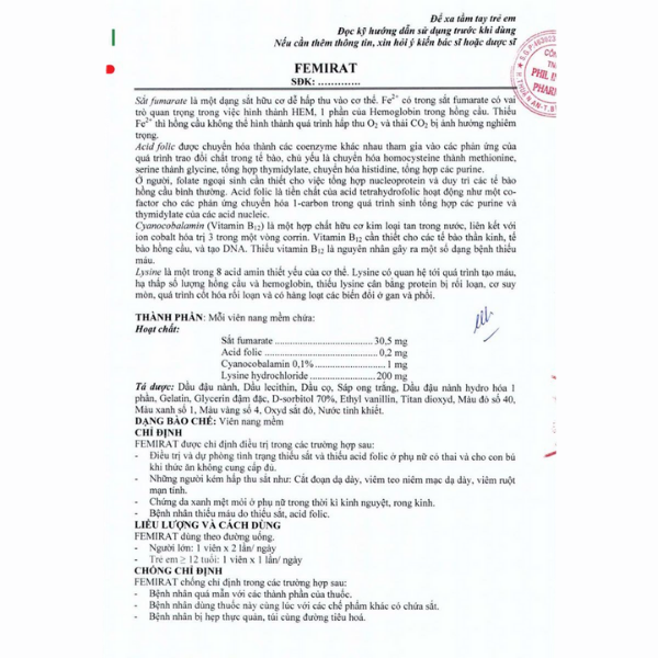 - Femirat là thuốc bổ sung sắt và acid folic, được sử dụng trong dự phòng và điều trị tình trạng thiếu máu do thiếu sắt, thiếu acid folic. Sản phẩm chứa Sắt fumarat, Acid folic, Cyanocobalamin (vitamin B12) và Lysin hydrochlorid, giúp hỗ trợ quá trình tạo máu, cải thiện tình trạng da xanh, mệt mỏi, hoa mắt, chóng mặt do thiếu sắt.