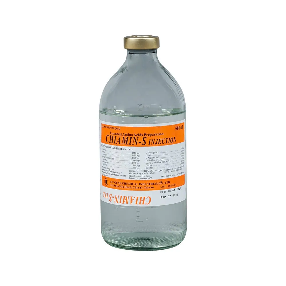 Chiamin-S Truyền (500 ml) – Dung dịch amino acid thiết yếu giúp phục hồi dinh dưỡng trong chấn thương, bỏng, suy nhược cơ thể; sản xuất tại Đài Loan, dùng theo chỉ định y tế.