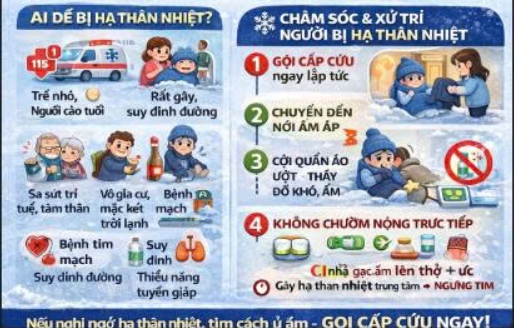 Hạ thân nhiệt là tình trạng nhiệt độ cơ thể giảm dưới 35°C, thường xảy ra khi tiếp xúc lâu với môi trường lạnh, mưa, gió, nước lạnh hoặc do suy kiệt, bệnh lý nền. Đây là tình trạng cấp cứu y khoa, diễn tiến âm thầm nhưng hậu quả rất nghiêm trọng.