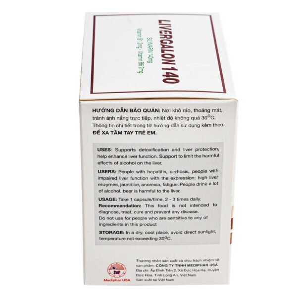 Livergalon 140 là sản phẩm của Công ty TNHH Mediphar USA, được sản xuất tại nhà máy đạt chuẩn GMP, đảm bảo an toàn và hiệu quả. Sản phẩm giúp giải độc gan, bảo vệ gan, tăng cường chức năng gan, hỗ trợ hạn chế tác hại của rượu bia. Với công thức chứa Silymarin, Vitamin B1, Vitamin B6, sản phẩm được điều chế bằng công nghệ viên nang cứng hiện đại, giúp tối ưu hiệu quả hấp thu và mang lại lợi ích tốt nhất cho người sử dụng.