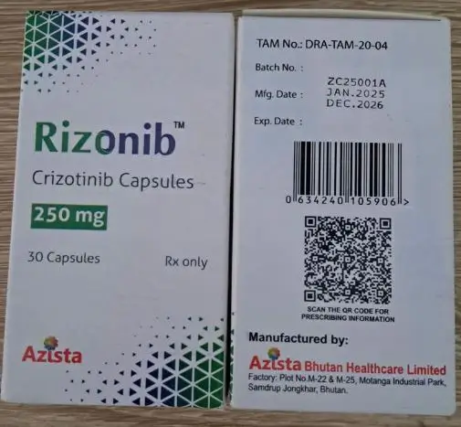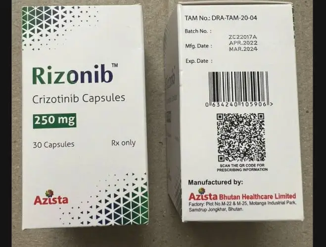 Thuốc Rizonib 250mg Azista là thuốc điều trị ung thư phổi giai đoạn nặng được sử dụng rộng rãi trên lâm sàng. Với thành phần chính là Crizotinib, thuốc thường được chỉ định để điều trị ung thư phổi không tế bào nhỏ (NSCLC) cho các trường hợp xét nghiệm phát hiện dương tính với 1 trong số các đột biến gen như ALK hay ROS1 và không đáp ứng điều trị với các phương pháp điều trị trước đó. Ngoài ra, thuốc cũng được ứng dụng trong điều trị ung thư hạch tế bào lớn, ung thư máu hoặc một số loại u khác.