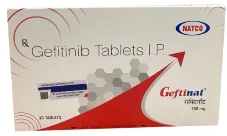 Geftinat (Gefitinib) là một loại thuốc dùng để điều trị ung thư phổi không tế bào nhỏ (NSCLC) ở những bệnh nhân có đột biến trong gen EGFR. Gefitinib là một thuốc ức chế tyrosine kinase, giúp ngừng sự phát triển của tế bào ung thư bằng cách can thiệp vào tín hiệu tăng trưởng của chúng. Thuốc này thường được sử dụng khi ung thư tiến triển hoặc không thể phẫu thuật.