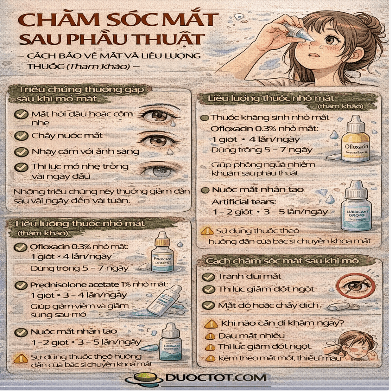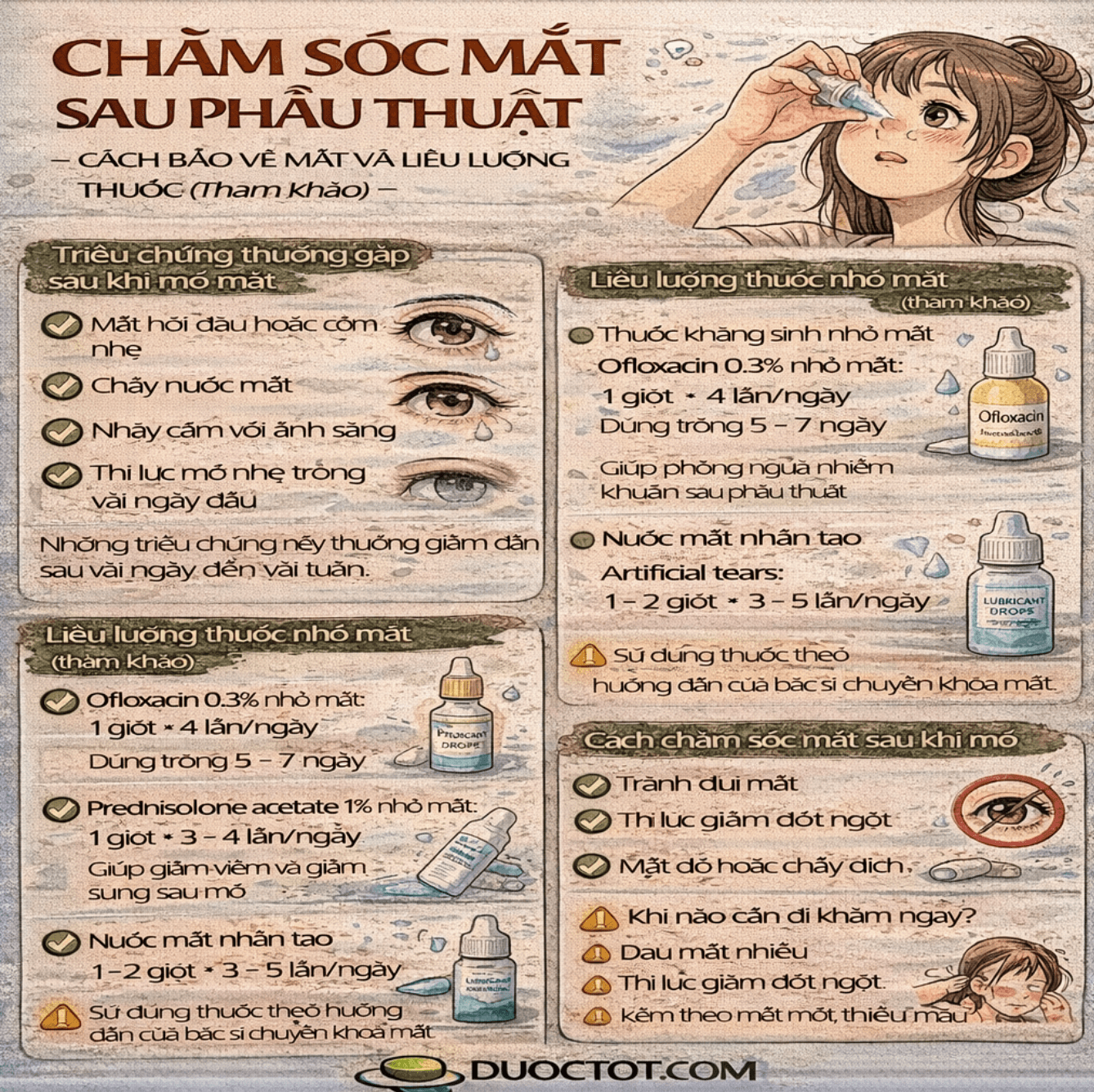 Sau khi phẫu thuật mắt (như mổ cận thị, đục thủy tinh thể hoặc phẫu thuật mắt khác), việc chăm sóc đúng cách rất quan trọng để giúp mắt hồi phục nhanh và tránh biến chứng. Người bệnh cần tuân thủ hướng dẫn của bác sĩ và sử dụng thuốc đúng liều lượng.